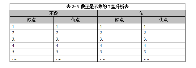 此時(shí),如果你習(xí)慣性地拿出一支筆、一張白紙,隨手畫一個(gè)T型分析表(見表2-2),也許就能幫你快速理清思路,做出你真正想要的那個(gè)正確的選擇。